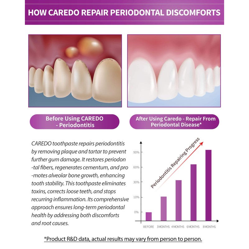 - TOOTH LOSS PREVENTION & SUPPORT - Supports cementum regeneration and bone recovery. With hydroxyapatite, CAREDO strengthens and stabilizes loose teeth while repairing bleeding gums and gum disease. It forms a protective shield for gums, easing discomfort and sensitivity.