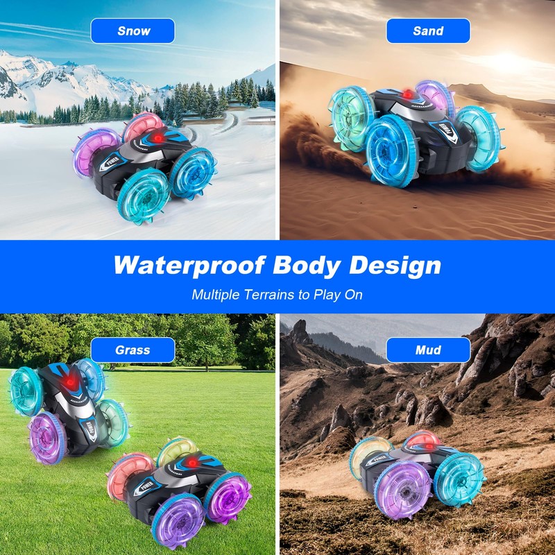 - Amphibious remote controlled car: Made of high-strength ABS plastic, which combines excellent durability, excellent shock resistance and stylish appearance. Innovative amphibious wheel design, easy to conquer the pool, beach, sand, mud and grass and other terrain, so that children can experience the endless fun of amphibious riding.