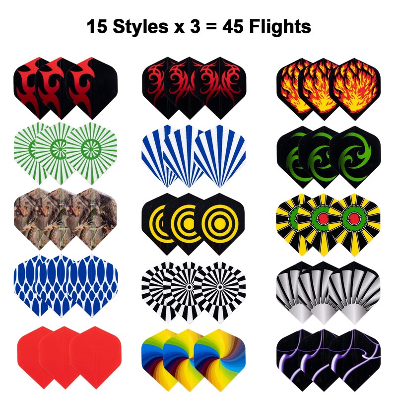 - Package includes: 12 darts + 45 additional flights with 15 different designs + 100 plastic dart tips + 1 x velvet bag + 1 x packaging box. Dart accessories include a variety of patterned tails that you can change at any time to create darts according to your desire and style.