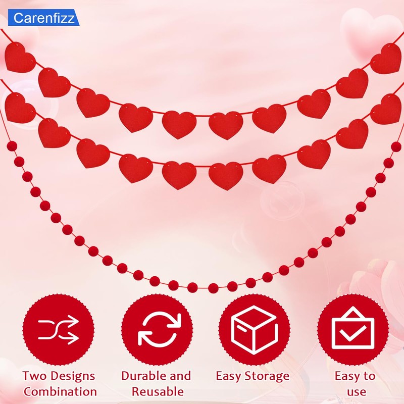 Carenfizz 6 Pack Valentines Day Garland Set, 40 Pcs Red Felt Hearts Garland Banner, 60 Balls Felt Garland, Red Pom Pom Garland for Valentines Day Decor, Kids Birthday Party, Wedding Anniversary etc.