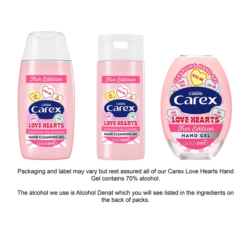 - 70 Percent Alcohol: Protect your hands against germs and bacteria with Carex Love Hearts hand gel; contains 70 Percent alcohol as Alcohol Denat. Great for using at home or on the go so you and your family can feel safe and protected
