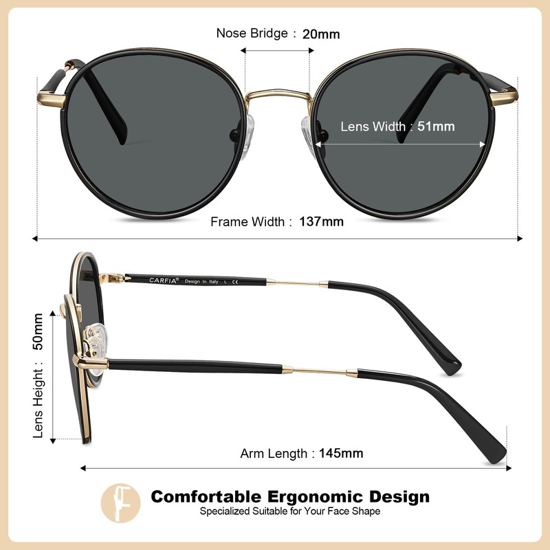 - Beautiful accessories: Due to the neutral round shape, women and men can wear these Carfia sunglasses. It is the right choice for an active lifestyle, such as hiking, gold, fishing, driving, shopping, travelling, photography.
