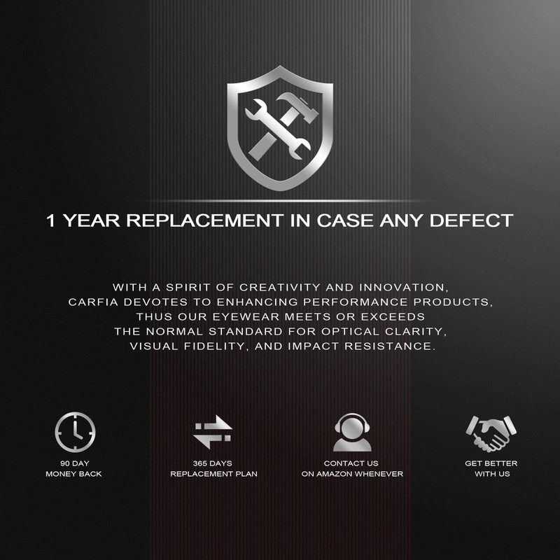 - 【UV400 Protected】All CARFIA lenses block over 99 percent of the sun's damaging rays and harmful blue light up to 400nm for your Clear, Comfortable vision as well as your eyes protection.