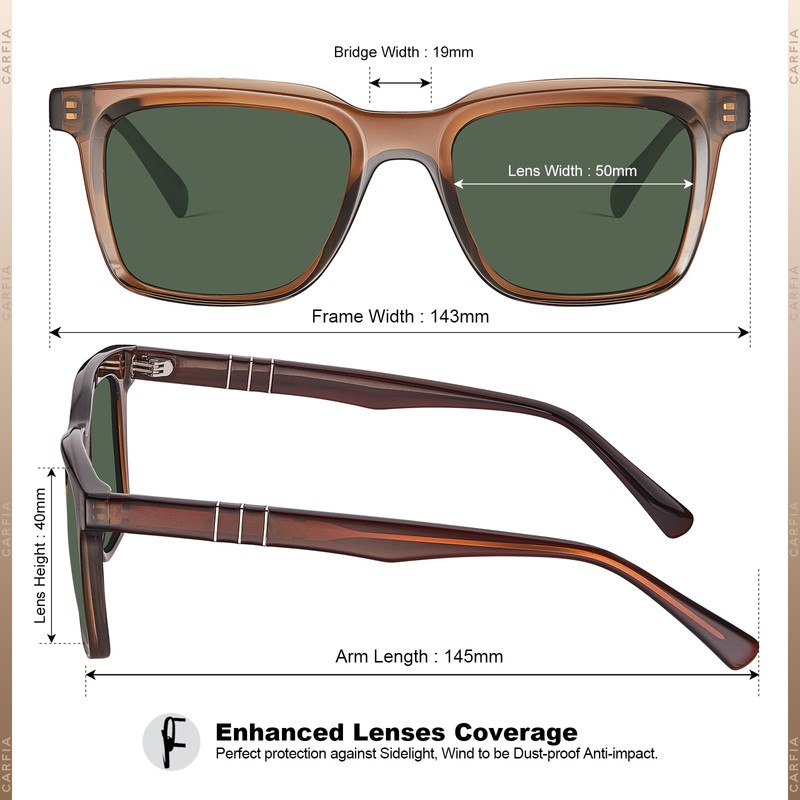 - When you buy glasses, you will get a hard box, a delicate Leather sunglasses case, a polarizing test card, and a soft cleaning cloth. CARFIA'S packaging design Exquisite and Practical just like a piece of art.In addition, we also provide 1 Free Replacement Service. CARFIA Always listen to your voice