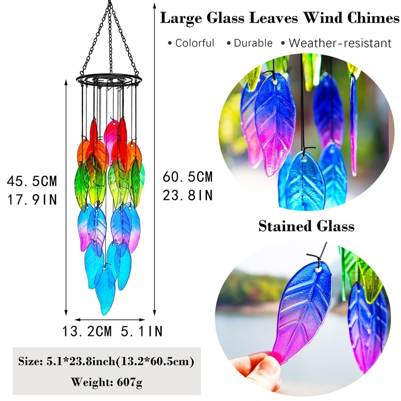 Carillones de viento de 18 pulgadas con hojas de vidrio para exteriores, hojas de arco iris, campanillas de viento, decoración al aire última intervensión, decoración de jardín