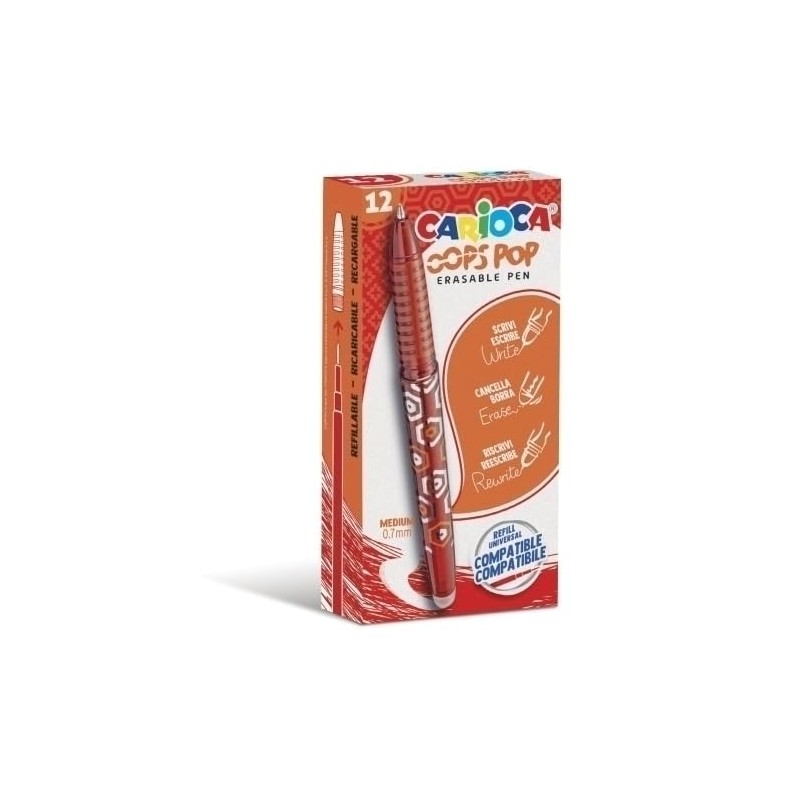 Carioca Oops Pop Eraser Pens Red - Pack of 12 | Refillable Pens for School and Office with Hood, Double Rubber and Ergonomic Handle, Red Pens, Pack of 12