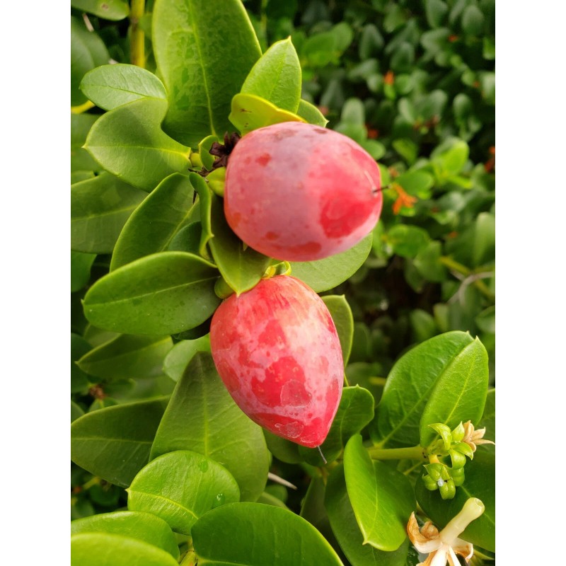 Natal plum is a shrub native to South Africa. ,(Carissa macrocarpa) they are beautiful and can thrive in sandy poor soil. Lovely white flower that smell of jasmine are followed by red fruit that is edible and delicious. These seeds are fresh! Harvested September 3rd 2020