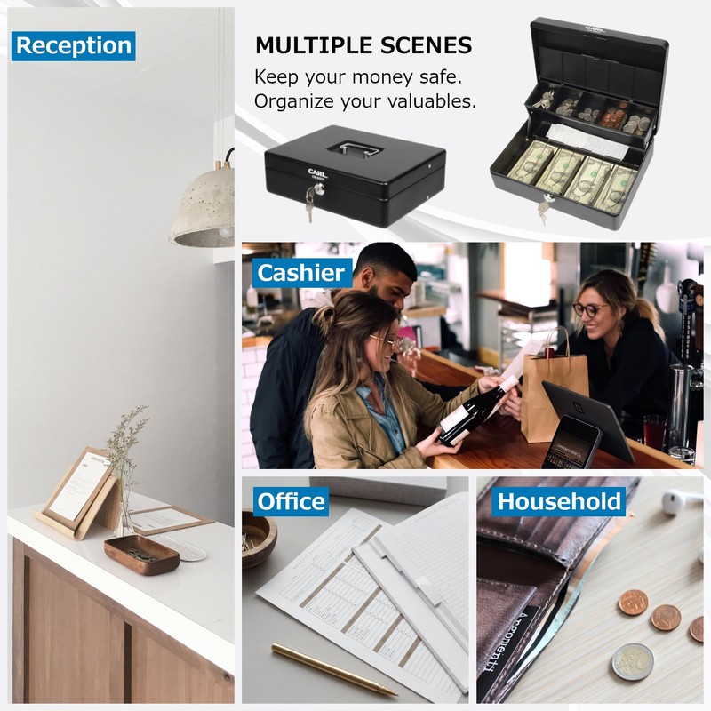 CARL Security box features a solid steel construction for enhanced durability that can be used in any cash handling setting. Four bill slots with clips and a tiered, five coin slot make it easy to quickly make the correct change to your customers. Hinged lid provides easy entry and access to contents. Security box is perfect for homes, schools, offices and more.