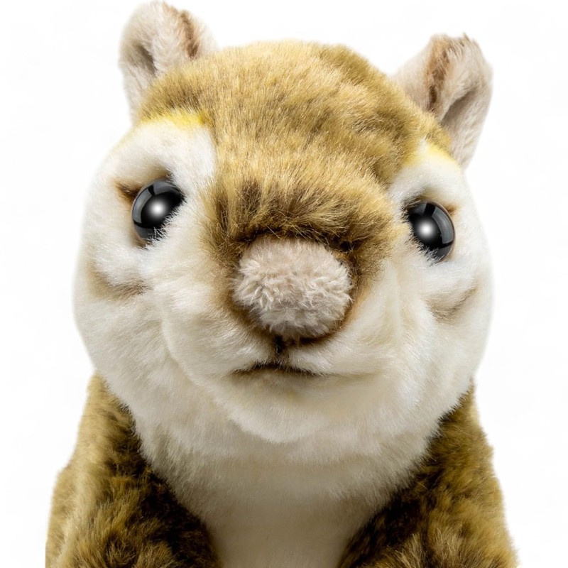 - The fur of the cuddly animal is brown. On the belly and face, the fur is creamy white. Giving its name, the chipmunk has beige fur with brown stripes streaked through the back. The stuffed animal has a lifelike appearance. The color of the safety eyes is brown.