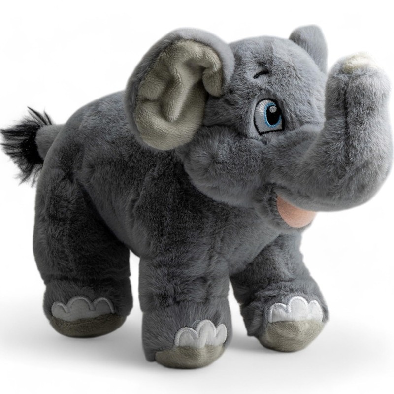 - This adorable elephant baby cuddly toy stands firmly on its small stuffed animal legs and is ready to conquer the heart of its future owner. Its soft, grey "fur" and round, compact shape make it particularly cuddly and give it an irresistible "I-am-simple-to-sweet" look.
