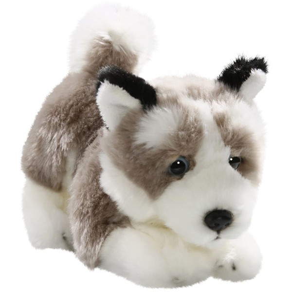 - The husky coat is in light grey, combined with white. The plush toy is still a fairly young dog, so a husky puppy. The colour of the safety eyes is blue.