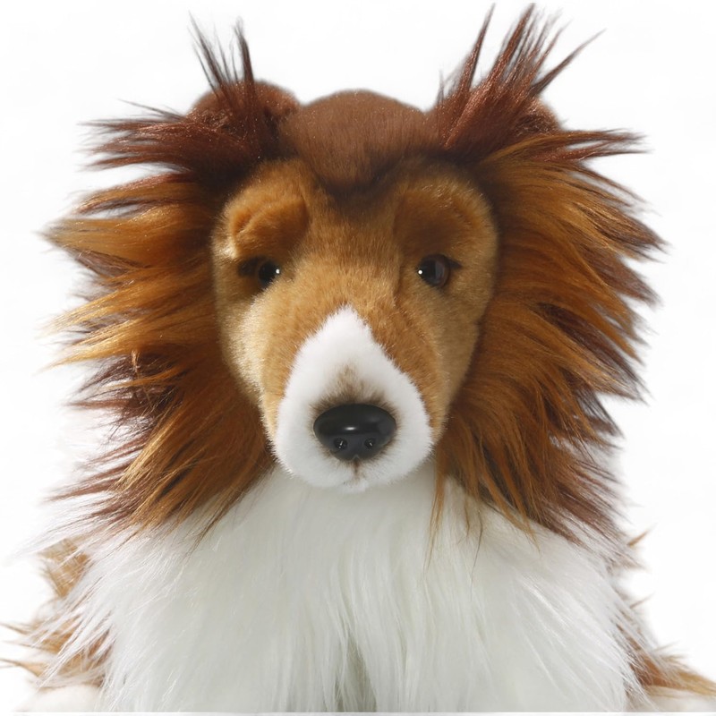 • The fur of the stuffed dog is light brown and dark brown. On the belly and paws the collie wears white. The color of the safety eyes is brown.