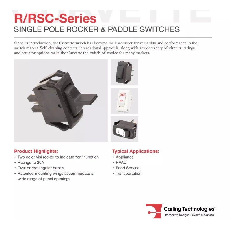 Carling Technologies - Founded in 1920, Carling Technologies is a global leading manufacturer of electrical and electronic switches and assemblies, hydraulic magnetic and thermal circuit breakers, electronic controls, and power distribution units. With four ISO certified manufacturing facilities and corporate offices worldwide, Carling Technologies does much more than manufacture electrical components, it engineers powerful solutions!. Carling Technologies RA901-VB-B-9-V Switch Rocker SPST 16A 250V Black Overview: The R-Series Curvette single pole rocker switches are aesthetically pleasing miniature snap-in switches. Due to the patented mounting ear design, they are compatible with a wide range of standard panel cutouts. Options include a range of momentary and maintained single or double throw circuits, various terminations, and legend options, as well as a variety of rocker colors and styles, including our unique curved two-color molded Visi-Rocker® for low cost "ON" indication. Since its introduction, the Curvette switch has become the barometer for versatility and performance in the miniature switch market. Self cleaning contacts, International approvals, along with a wide variety of circuits, ratings, and actuator options make the Curvette the switch of choice for many applications. |