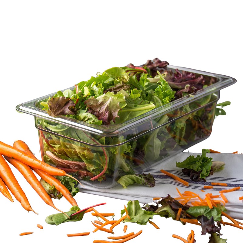 - Made from polycarbonate, this food pan is resistant to impacts, stains, and odors, making it ideal for use in busy kitchens and food preparation areas