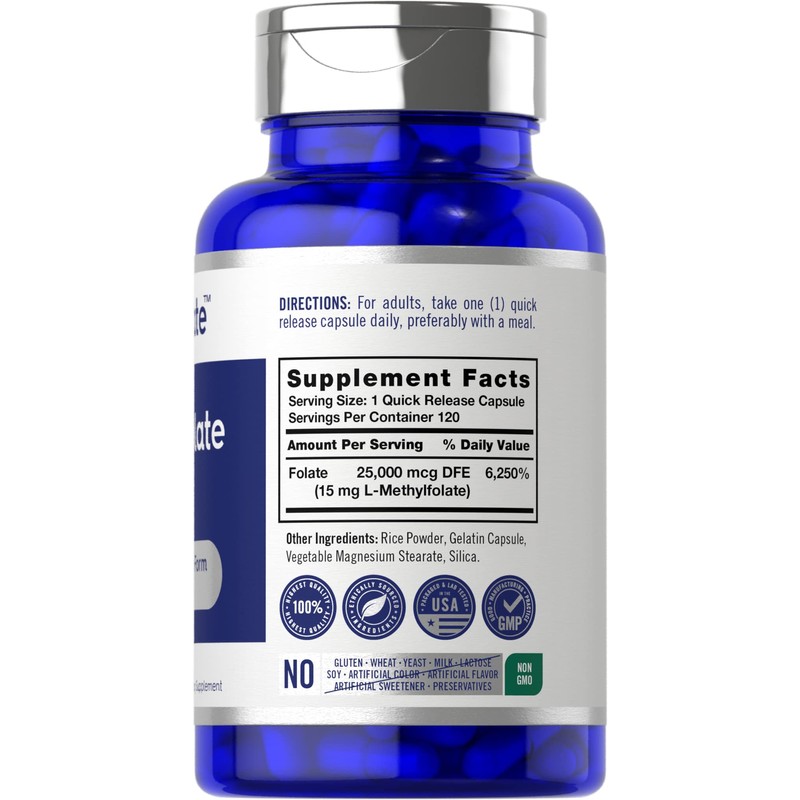 - COMPLETE FORMULA: Quick-release capsules deliver 25,000 mcg Folate (15 mg L-METHYLFOLATE)