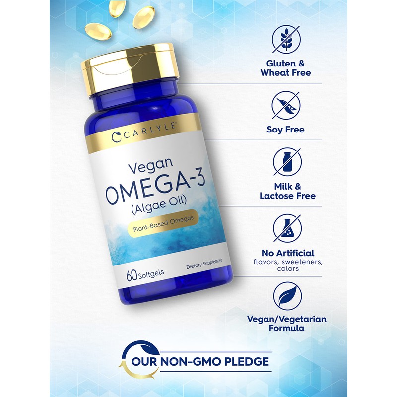 Carlyle Omega-3 Softgels: Carlyle Plant-Based Omega-3 supplement offers 200 mg of Omega-3 in each convenient softgel. We use the finest source of Algae Oil to provide a vegan source of beneficial DHA. Our vegan formula is gluten-free and non-GMO, making it the best source of Omega-3 nutrients for a vegan or vegetarian lifestyle.