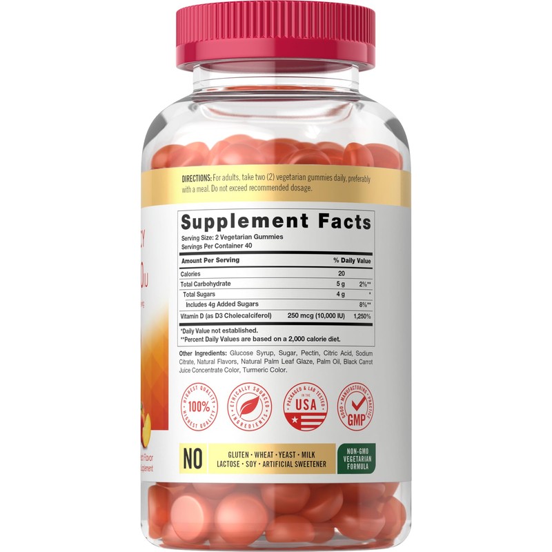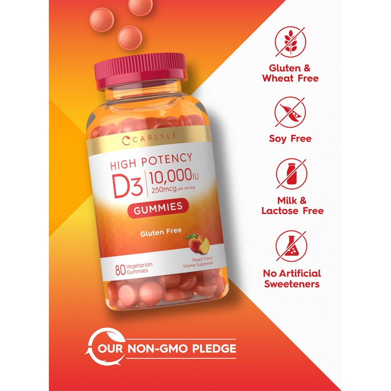 Carlyle Vitamin D3 10,000 IU Gummies – Peach Flavor, 80 Count – High Potency, Vegetarian, Non-GMO, Gluten-Free, No Artificial Sweeteners