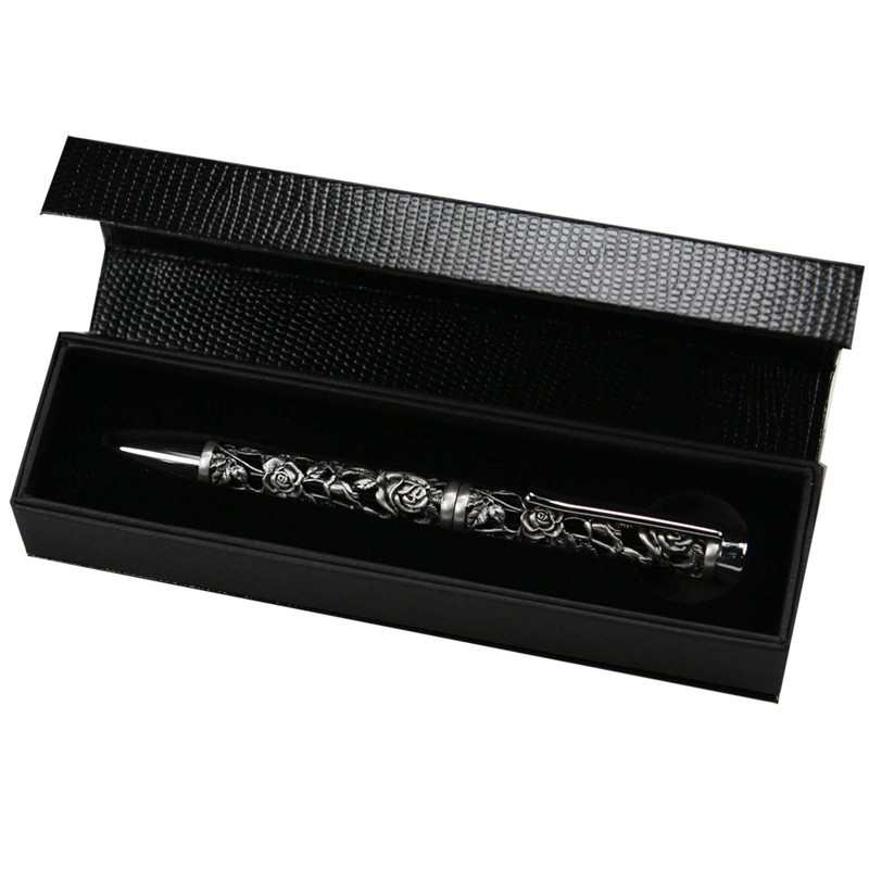 - Unique pen, made by specially carved metal with a rose pattern. Contrasting matt metal and black lacquered, polished finishes. Stylish and elegant. This lovely office accessories beautifully presented in a gift box, making this an ideal present.