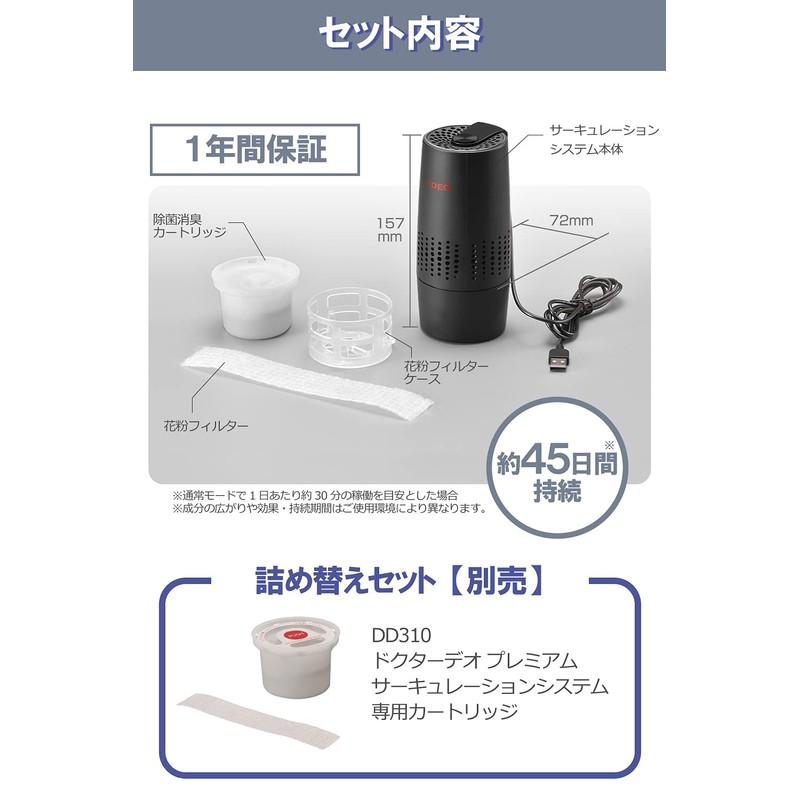 - Disinfecting and deodorizing cartridges are refillable (DD310: sold separately) and will last for approximately 45 days. When using in normal mode, approximately 30 minutes of operation per day (depending on the usage environment, the expansion, effectiveness, and sustainability. )