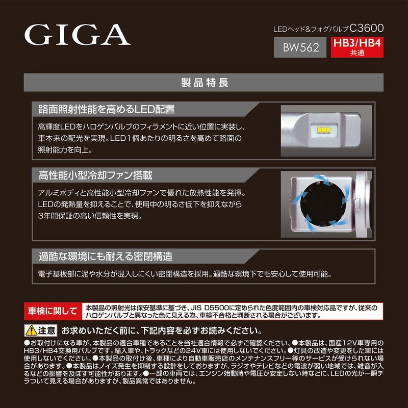 - Bulb Type: HB3/HB4, Total Luminous Flux: 3600lm (total 2 lights), Color Temperature: 6000k