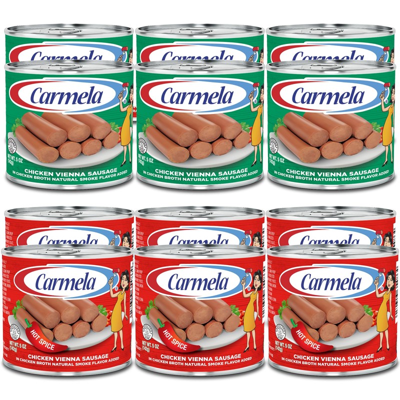 Carmela Chicken Vienna Sausage Variety Pack – 12 Cans (Six Original + Six Hot Spice) – Ready-to-Eat Canned Sausage in Chicken Broth, Shelf-Stable Protein