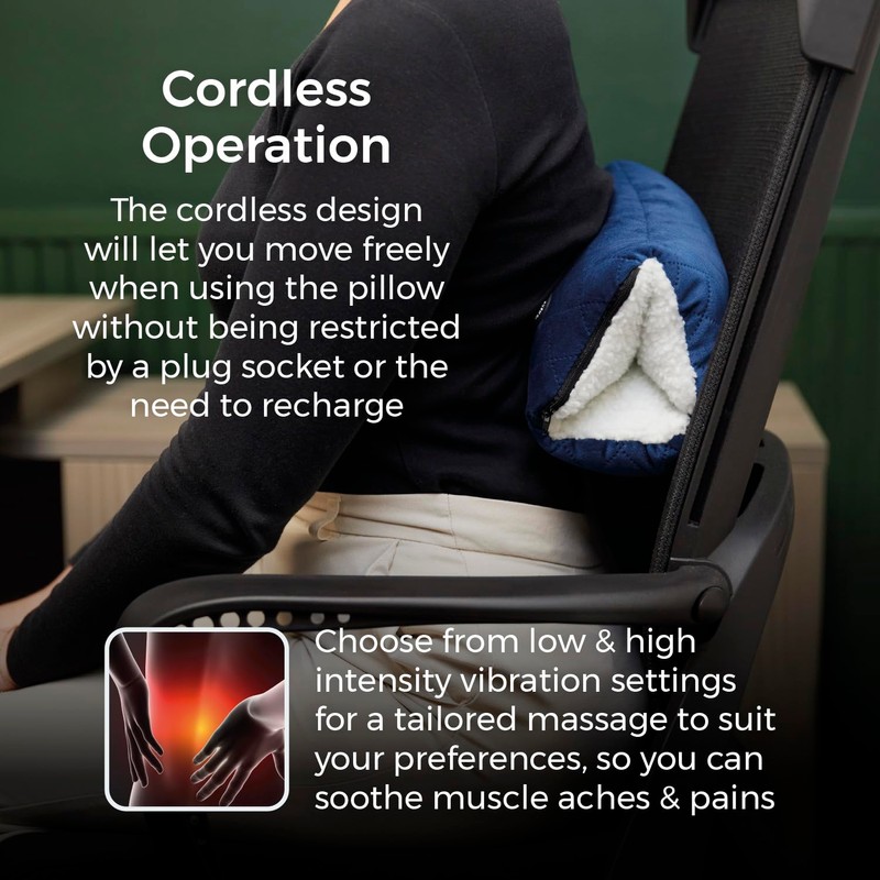 - CORDLESS OPERATION: The cordless design will let you move freely when using the massager without being restricted by a plug socket or the need to recharge, optimal for travelling or commuting; The pillow requires 2x AA batteries to run (not included)