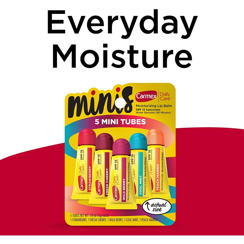 - Five 0.18 oz tubes Carmex Daily Care Minis Lip Balm Pack