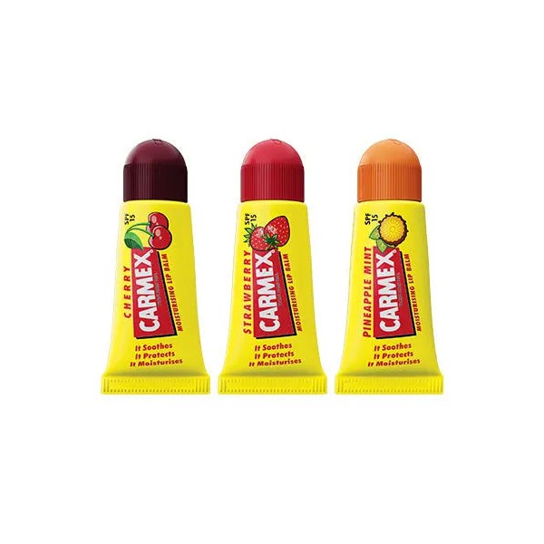 The Carmex Mini Tube Set contains three super fine Carmex lip balms! These balms soothe, lighten and moisturize your lips. The set contains a cherry, strawberry and pineapple variant.