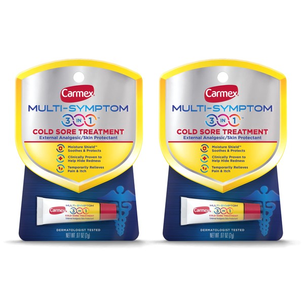 - Two 0.07 oz packages of Carmex Multi-Symptom 3-in-1 Cold Sore Treatment