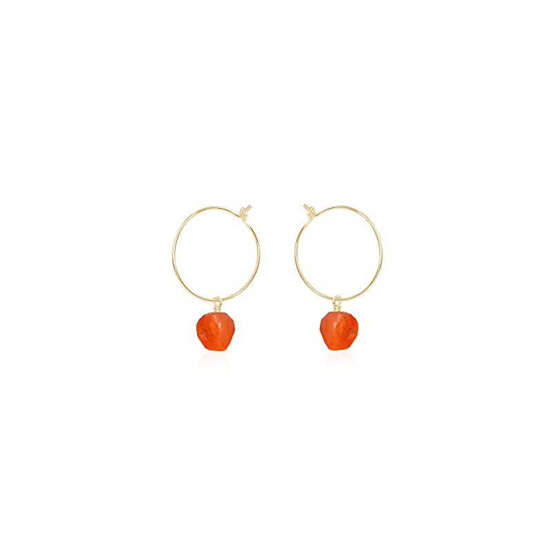 They feature raw, genuine carnelian crystals that dangle from the hoop earrings.