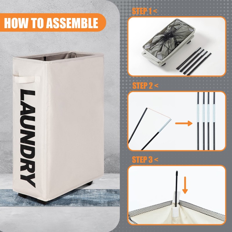 - 【Tall & Rolling】Metal frame shapes slender & tall laundry basket organizer firmly. Slim shape storage bin easily fits into narrow space. Laundry basket with wheels ensures easy movement;