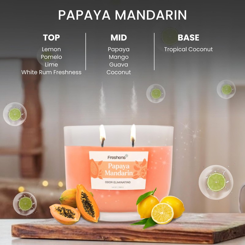 - Papaya Mandarin: Indulge in the refreshing and luxurious scent of Papaya Mandarin reminiscent of a tropical paradise. Papaya Mandarin features notes of freshly squeezed lemon, succulent papaya and mango nectar swirled with creamy coconut milk that adds a rich and velvety smoothness.