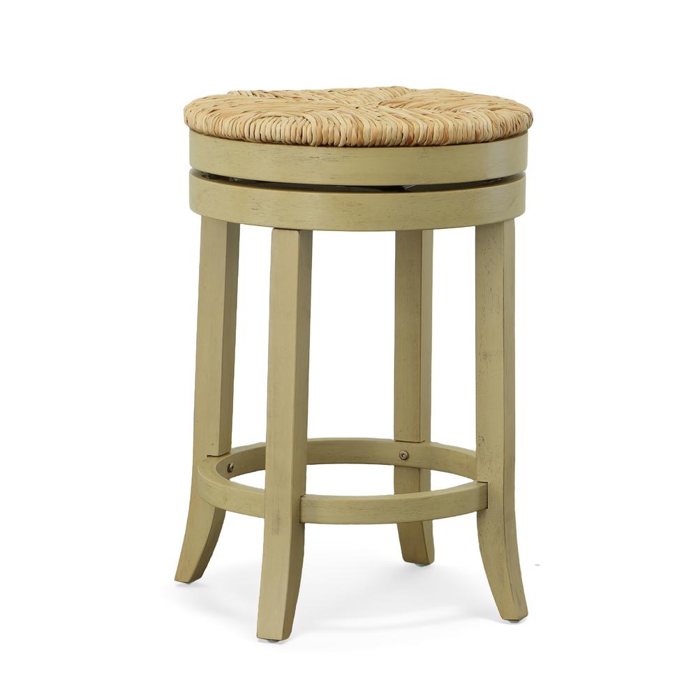 Bring a breezy look to your bar, or tall pub table with our backless Irving 24" Counter Stool. It's built with a solid wood frame, which features a multi-step hand finish with rubbed edges for a worn look. There's a footrest at the bottom for comfort, and a swivel apparatus below the seat. Its circular seat is topped with woven rushes for a natural look.