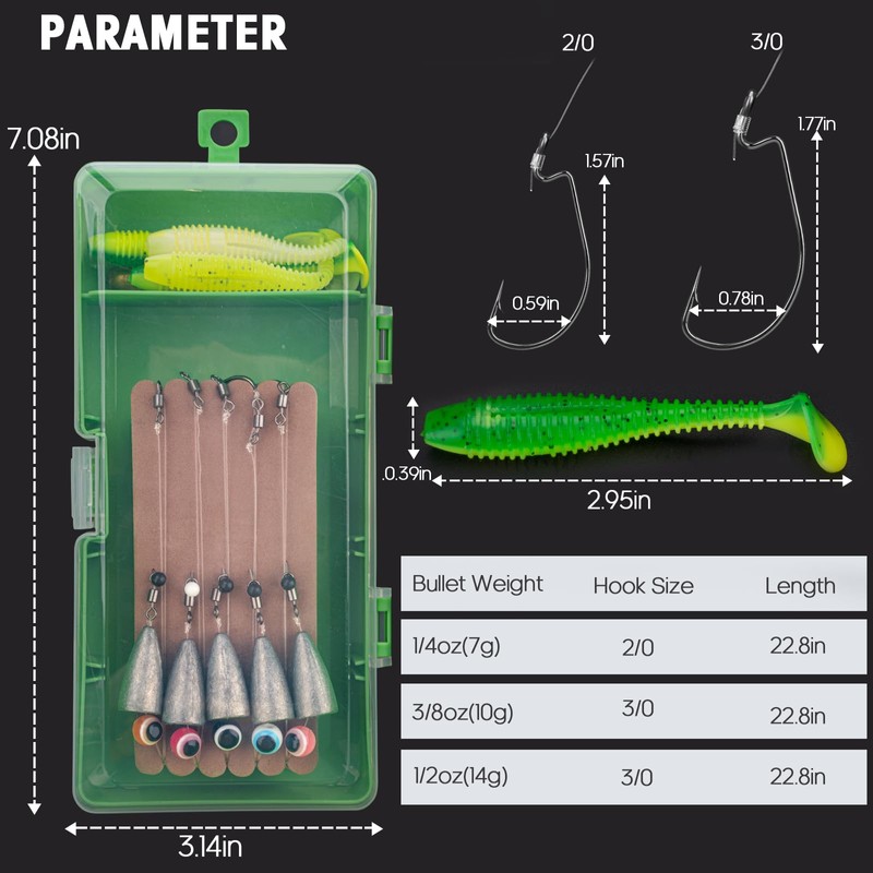 - 10pcs Hand-tied Carolina rigs: Each stainless steel fishing leader with weight is consist of 2 swivels, one fishing weight, one snap, and a vivid fishing eye bead. The QualyQualy fishing lure kit comes with 5 extra soft baits and a storage box