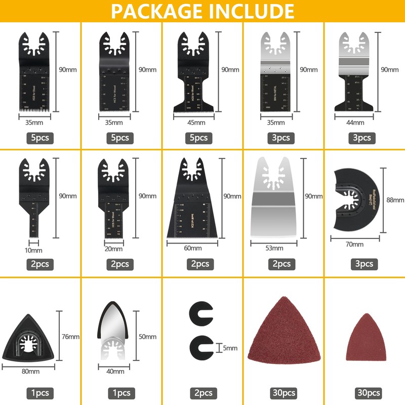 - 【Versatility 96Pack Oscillating Tool Blades】The Oscillating Saw Blades 96-piece set includes blades with 11 different oscillating multitool blades, 2 pads, and 60 sandpapers, allowing for precise and controlled cutting, grinding, polishing, and shoveling needs. It is suitable for cutting wood, metal, plastic, drywall, plasterboard and more. The versatile blades allow users to tackle different materials and projects with ease.