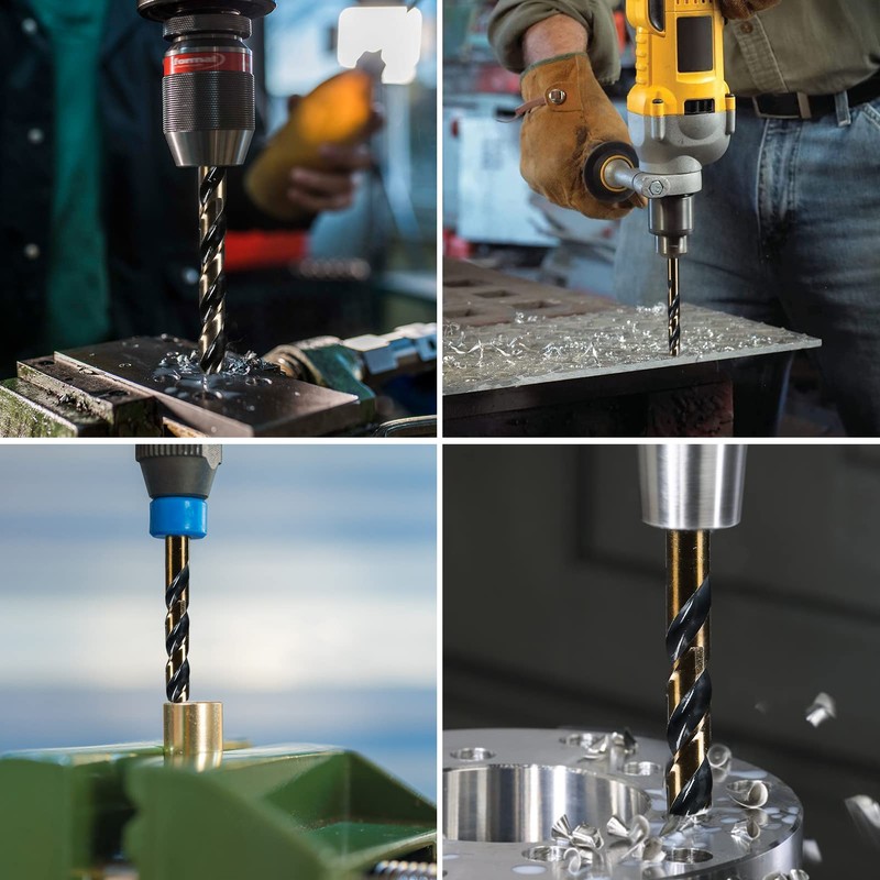 • Metal drill bit set for steel: Featuring 135-degree split point with round straight shank, an intelligent self-centering design which prevents walking, fully ground twist design ensuring a cooler drilling performance by decreasing friction, this drill bit set easily drills through a wide variety of materials including stainless steel, cast iron, high temperature alloy, titanium alloy, hard plastics and wood.