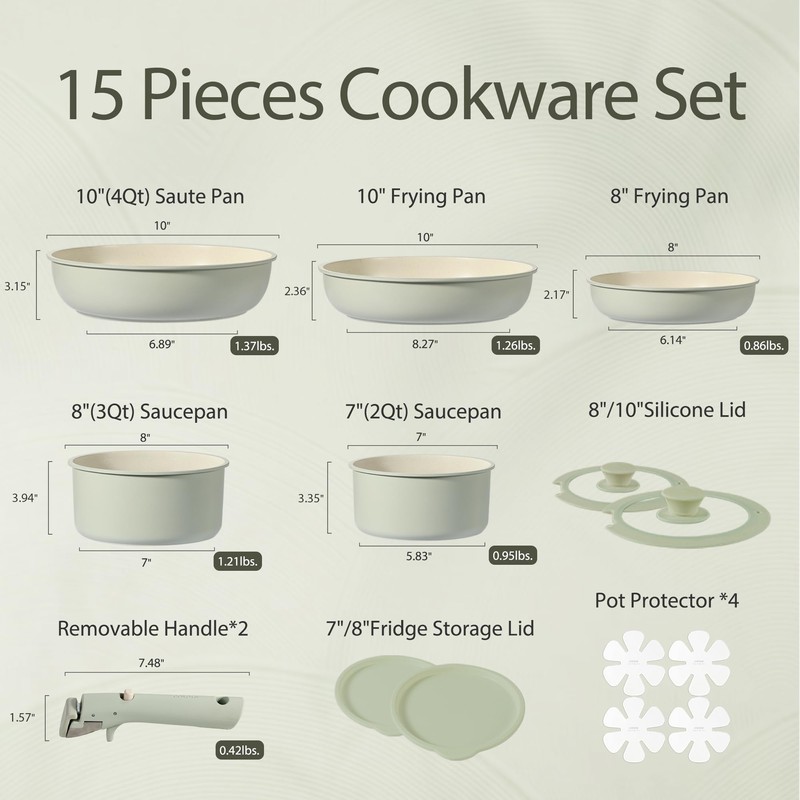 • Click, Cook, Carote: This cookware set includes 10'/8' fry pans, 3qt/2qt saucepans, 4qt/10' saute pan, 2*removable handle, 10'/8' silicone lids, 8'/7' storage lids,4*pan protectors. These lids and handles can satisfy every pot and pan.