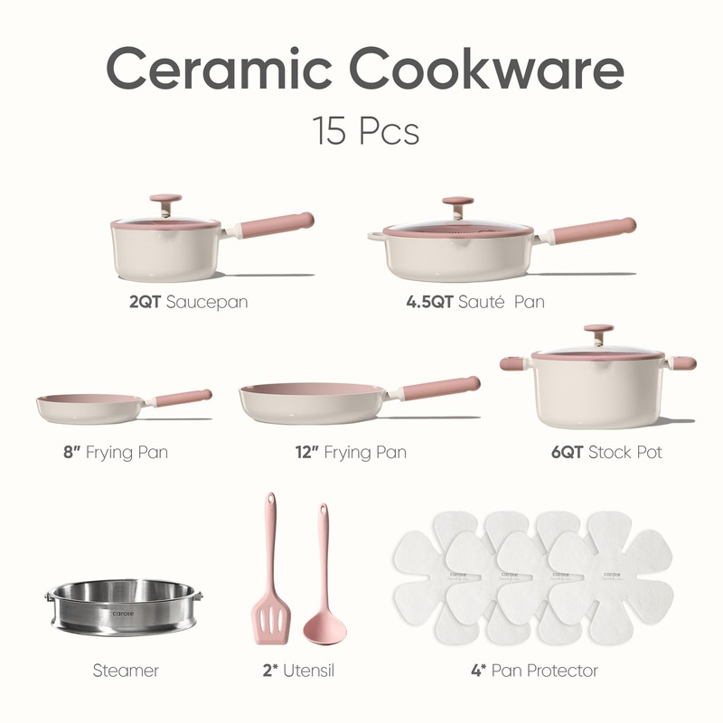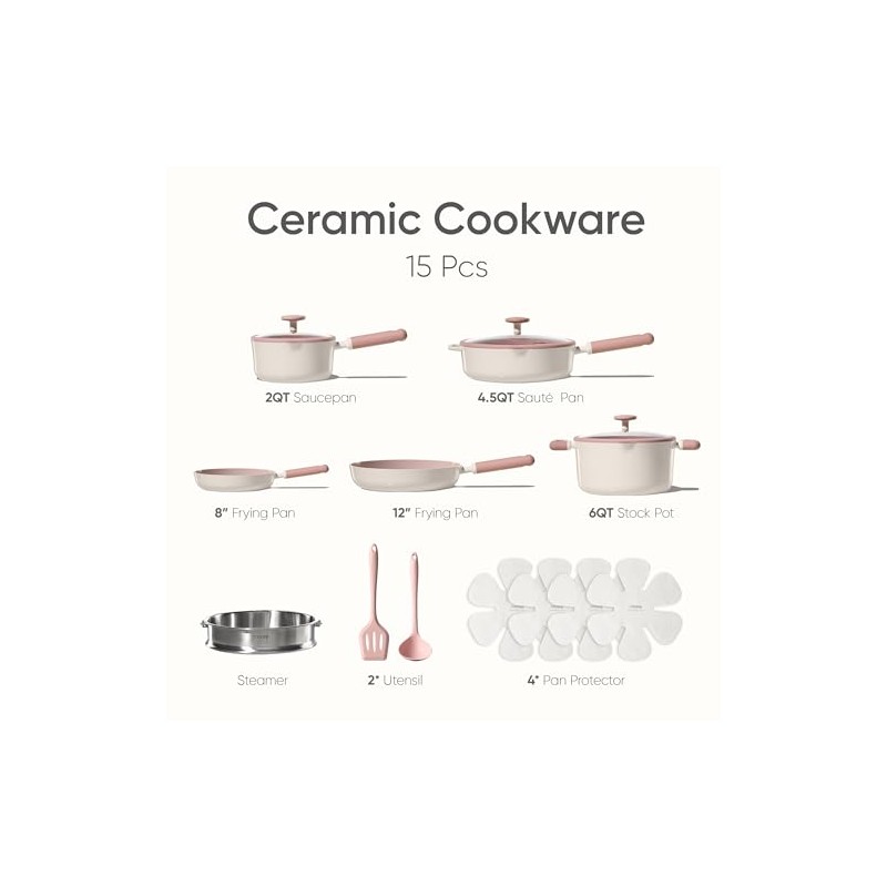 CAROTE Pots and Pans Set Nonstick, Ceramic Cookware Set, Pink Cooking Set Kitchen Induction Set with Steamer, PFAS PTFE Free,15 Piece