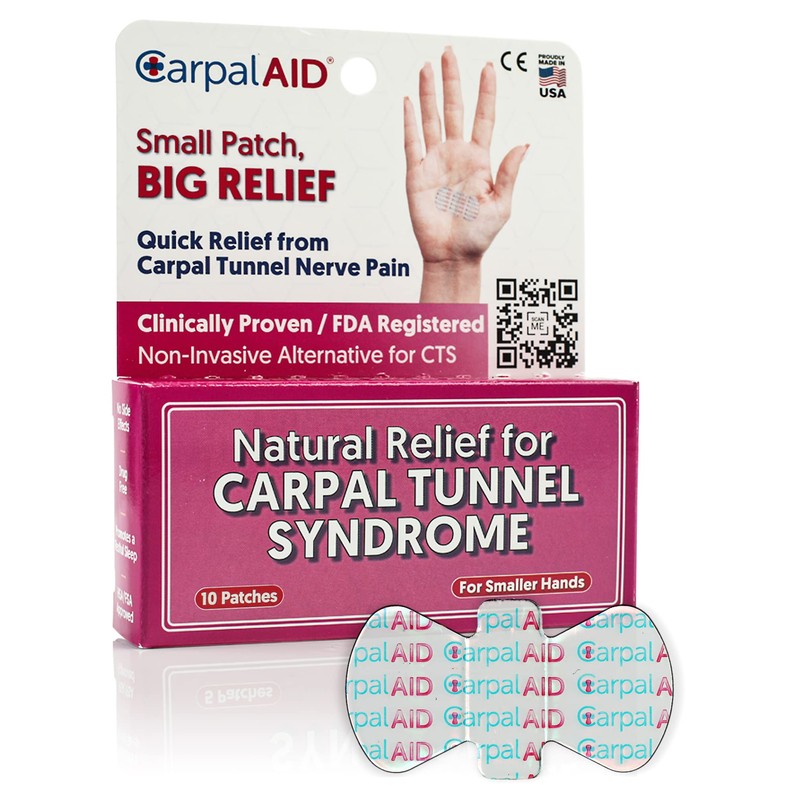 - CarpalAID helps to support the reduction of consequences from Carpal Tunnel Syndrome for hours at a time. This handy little self adhesive patch is designed for long-term wear, with cumulative results for muscle and nerve conditions of the hand, wrist and lower arm. For immediate first aid needs for scratches, cuts, burns, or other kinds of open wounds, a traditional bandage or dressing is recommended.