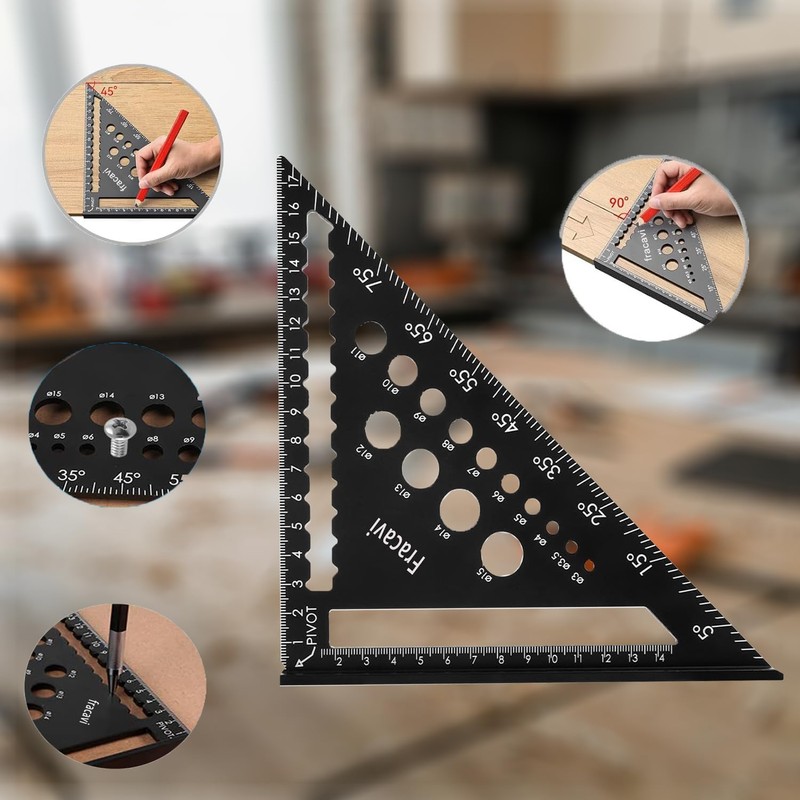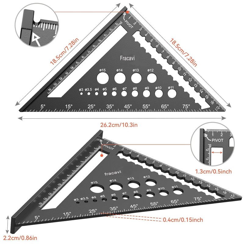 - Multifunctional writing square: this carpenter ruler offers both frame angles, triangular angles, mitre angles and protractor angles and can be used as a scriber. You can easily draw parallel, right-angled and angled lines, locate holes for drilling and determine the height of the table saw with just a quick ruler. This allows you to work quickly and efficiently and save valuable time in woodworking. With 0-90° protractor scale