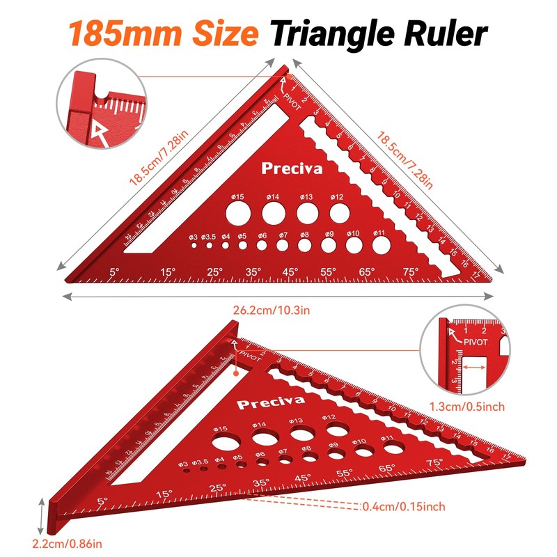 • 5-in-1 multifunctional triangular ruler: it can draw 45°/90° angles, parallel/vertical lines, locate drill holes and determine the height of the workbench, which can meet the different work needs.