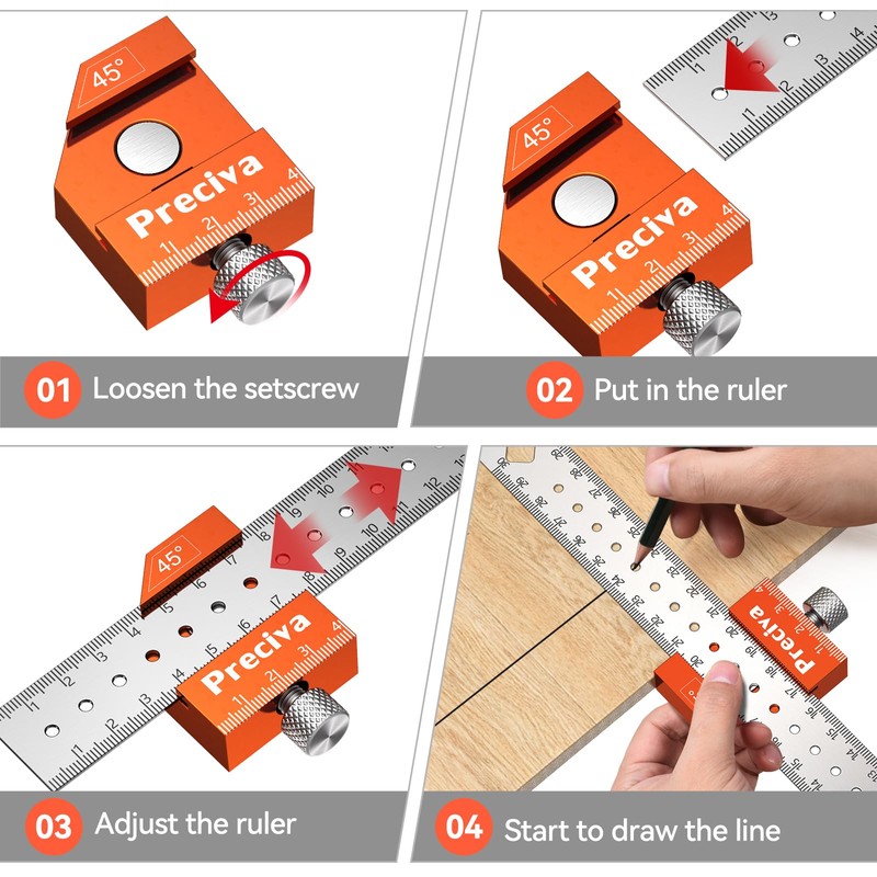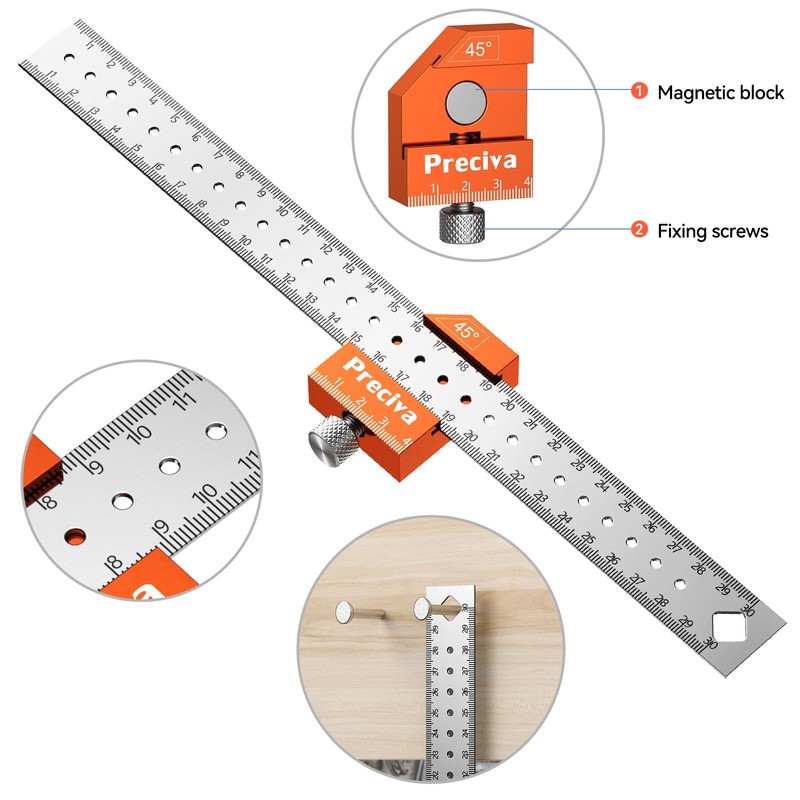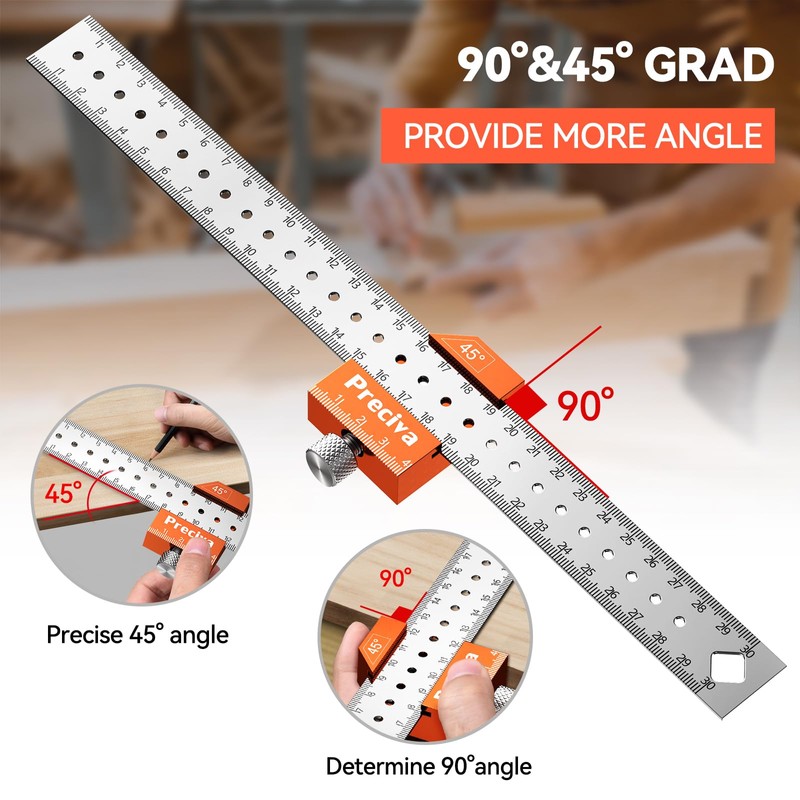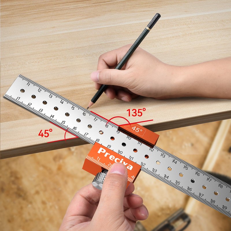 - [Multi Use of One Ruler] ----This engineer slide ruler set can not only be used to draw horizontal lines, but also has a 45 ° inclined plane reserved on the slide, which is very suitable for 45° and 90° manual applications in woodworking. With centimeter measurement function, there is a small hole every 1cm, which can make a horizontal line operation, saving the switching time of scribing and measurement;