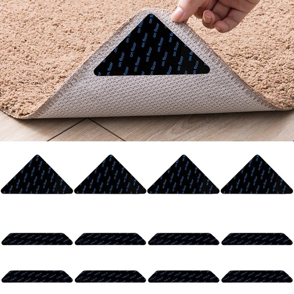 - 4 triangles + 8 trapezoid shapes: 4 triangle anti-slip tapes, 8 trapezoid anti-slip tapes, a total of 12 pieces. You can freely cut it to any shape or size with scissors depending on your application. Accommodates small mats to large carpets and rugs