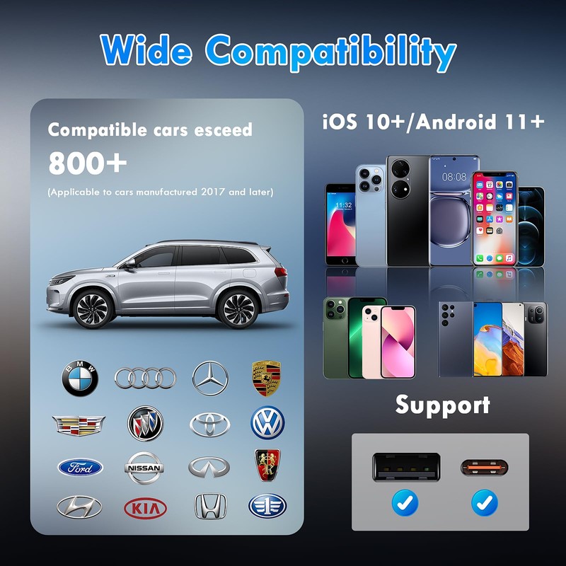 - Wide compatibility: the Android car wireless adapter is suitable for vehicles manufactured after 2017 with wired carplay, supports smartphones with iOS 10+ and Android 11+ and above and has USB-A/USB-C double interfaces for flexible adaptation to different models