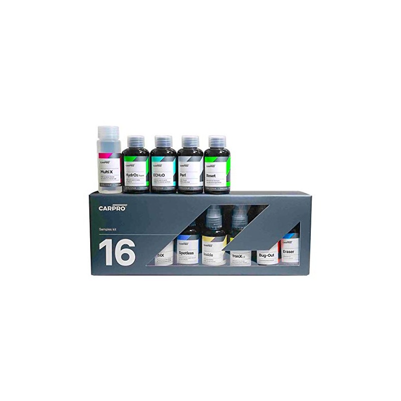 - KIT INCLUDES: CARPRO 50ml (2oz) bottles of the following- Bug-Out, ECH2O, EliXir, Eraser, FogFight, HydrO2 Foam, HydrO2 Lite, Inside, IronX LS, Multi X, PERL, Reload, Reset, Spotless, TarX and TriX. A perfect way to sample the car maintenance made.