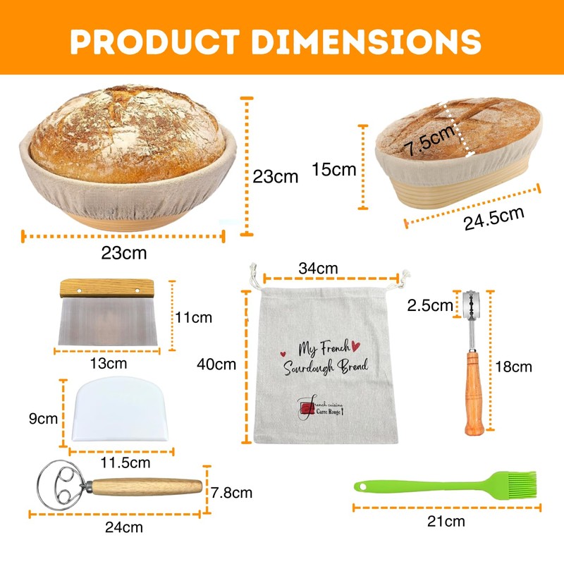 - COMPLETE BREAD MAKING KIT: Our bread proofing basket set includes everything you need for baking delicious golden bread. This bread baking kit contains a dough whisker for exciting wet dough quickly, a stainless steel Scraper, a flexible dough scraper to easily remove dough from the bread basket, a Scoring Lame with extra blades for dough expansion. These proofing bowls for sourdough bread come with 2 linen liners and one organic bag for storing bread.