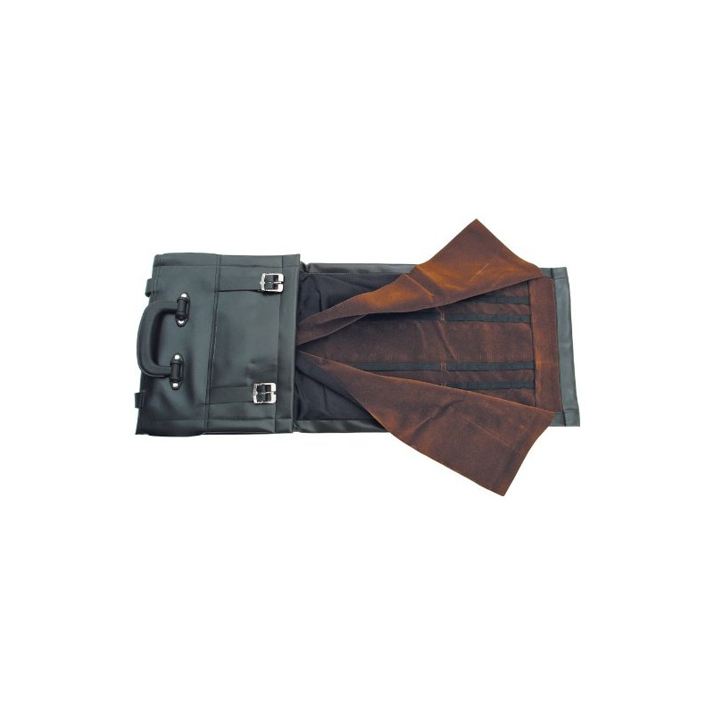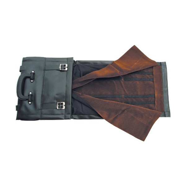 Durable vinyl construction with leather straps and heavy cloth lining. Sturdy handle for easy carry. Holds approximately 60 knives.