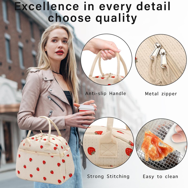 Carry bloom Lunch Box for Women, Insulated Lunch Bag Cute Corduroy Lunchbag Reusable Lunchbox for Work,Strawberry Beige