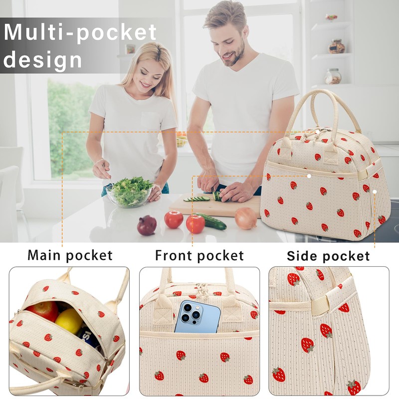 Carry bloom Lunch Box for Women, Insulated Lunch Bag Cute Corduroy Lunchbag Reusable Lunchbox for Work,Strawberry Beige