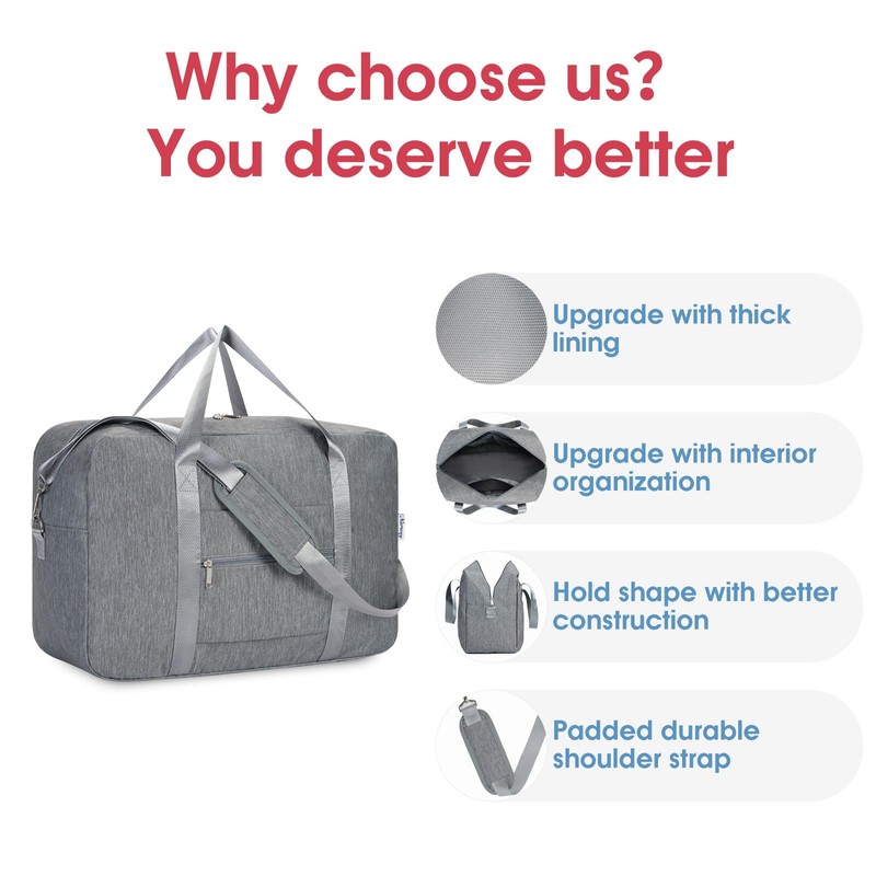 Carry on luaggage 22x14x9 Airlines Approved Foldable Carry on Bag Travel Duffel Packable Duffle Overnight for Women and Men 40L (Grey)